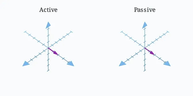 This is another arbitrary convention, and it applies to all rotation formalisms, not just Euler angles. The question is: does a rotation indicate an object rotating in a fixed reference frame, indicating an active rotation, or is the reference frame rotating about an object fixed in the frame, indicating a passive rotation? This often comes down to if the natural frame of reference is fixed to a moving body, such as the local level frame of an aircraft, or if there is a sensible global frame, such as the world frame of a video game. Either way, the conversion between active and passive is simply the inverse rotation.