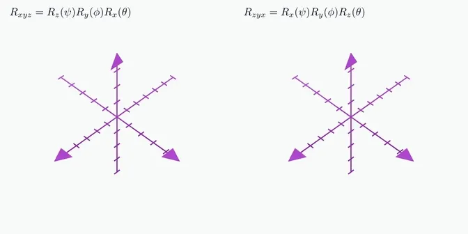 Euler angles describe a rotation by de-composing it into into three discrete rotations about two or three orthogonal axes2. The order in which these rotations occur is called the axis sequence, and is of critical importance. Because matrix multiplication is not commmunitive, the following DCMs constructed from Euler angles are not the same: